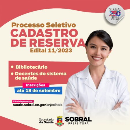 As inscrições acontecem entre os dias 8 e 18 de setembro, e deverão ser efetuadas por meio do sistema de seleção da Prefeitura de Sobral, de acordo com as instruções dos editais.
