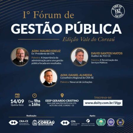 O Conselho Regional de Administração do Ceará (CRA – CE), anuncia e convida para o primeiro Fórum de Gestão Pública de Coreaú, a ser realizado no próximo dia 14/09, na EEED Gerardo Cristino, com a presença de vários palestrantes. Além de autoridades locais, os promotores aguardam gestores públicos dos mais diversos municípios da Região Norte, Ibiapaba e de outras áreas do Ceará.
