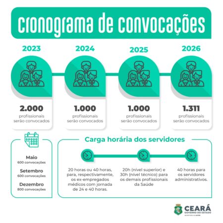 O Governo do Ceará obedece ao cronograma de convocação dos aprovados no concurso, estabelecido por meio do decreto de número 35.409. De acordo com o calendário, serão, ao todo, dois mil profissionais convocados até o fim deste ano.