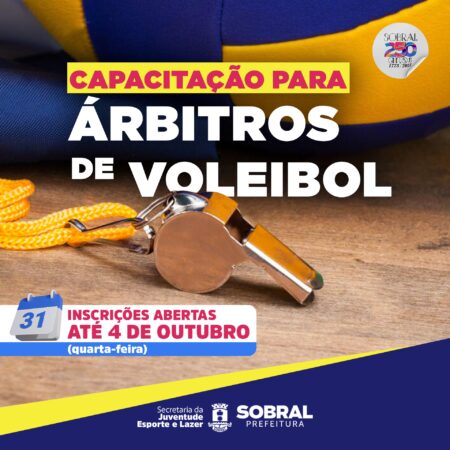 Estão abertas, a partir desta segunda-feira (25/09), as inscrições para Capacitação de Árbitros de Voleibol. O curso é uma realização da Prefeitura de Sobral, por meio da Secretaria da Juventude, Esporte e Lazer (Secjel). As vagas são limitadas e restritas aos nascidos e/ou residentes do município.