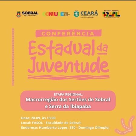 Se liga, juventude ️ A cidade de Sobral recebe nesta quinta-feira (28/9) a etapa regional das macrorregiões Sertão de Sobral / Ibiapaba da Conferência Estadual da Juventude. . Convide seus amigos e amigas e ajude na construção das políticas públicas de juventude. O evento acontece na Fasol – Faculdade de Sobral, no prédio do Sindicato dos Calçadistas, ao lado do Cirão, com inicio previsto para 13h.