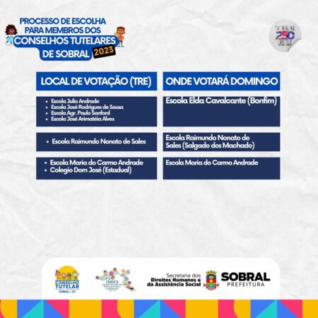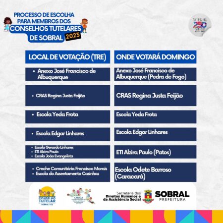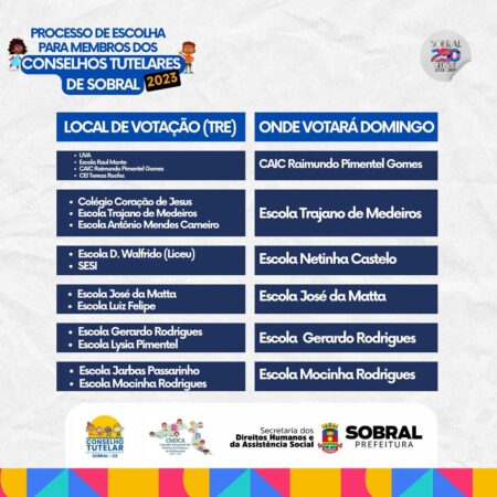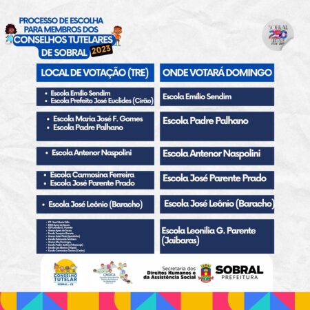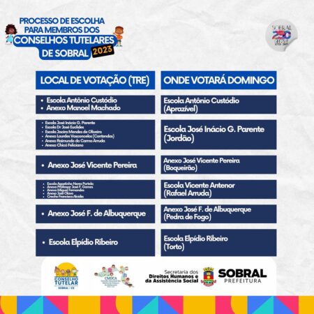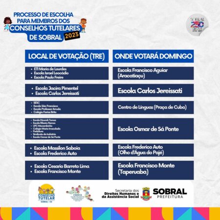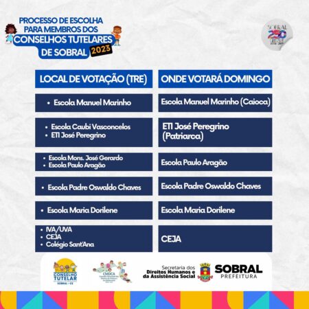 Neste domingo (01/10) é dia de votar para escolher os conselheiros tutelares de Sobral para o período de 2024-2028. Mas, diferente das eleições gerais ou municipais, a quantidade de locais de votação é reduzida, até porque o voto, nesta eleição, é facultativo.