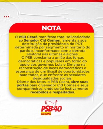 A nota do PSB afirma que Cid é vítima de uma ala do PDT inconformada com a derrota nas eleições de 2022.