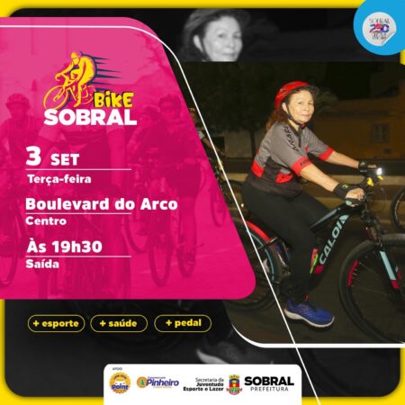Terça-feira é dia de pedalar pelas belas ruas de Sobral com o turma da Secretaria de Esporte, Lazer e Juventude. O ponto de encontro será no Boulevard do Arco, nesta terça-feira (3/10), a partir das 19h30.