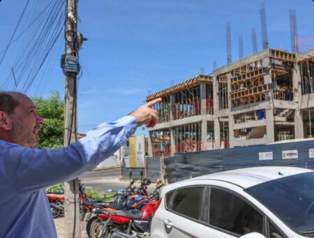 Depois, acompanhado do secretário da Infraestrutra, Davi Bastos, o prefeito foi conferir de perto as obras do Hospital Municipal Estavem Ponte, que está recebendo a concratagem da terceira lage, e que segue com suas obras em ritmo intenso.
