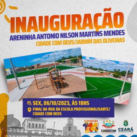 A Prefeita de Camocim, Betinha Magalhães, inaugura nesta sexta-feira, 6 de outubro, às 18h, a Areninha Vereador Nilson Martins, no bairro Jardim das Oliveiras. O evento contará com presença do Assessor Especial de Assuntos Municipais, Artur Bruno, representando governador Elmano de Freitas, do secretário de Esportes do Estado, Rogério Pinheiro e do deputado estadual Sérgio Aguiar.