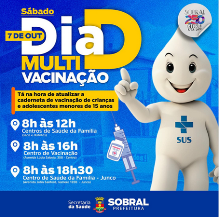 A Secretaria da Saúde de Sobral realiza, neste sábado (07/10), o Dia D da campanha de multivacinação nos Centros de Saúde da Família (CSF), da sede e distritos, das 8h às 12h; no Centro de Saúde da Família do Junco, das 8h às 18h30; e no Centro de Vacinação, das 8h às 16h.
