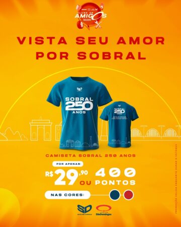 Sobral completou 250 anos!! Mostre seu amor por nossa princesa do norte com as nossas camisas comemorativas, por apenas R$29,90 ou por 400 pontos do Clube de amigos. Disponíveis nas cores azul e vermelho.