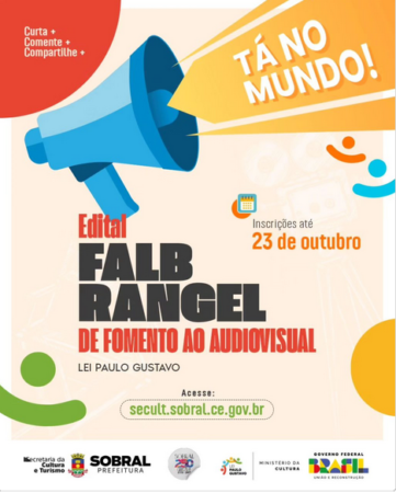 A ESPERA ACABOU!! A Secretaria da Cultura e Turismo divulgou, nesta sexta-feira (06/10), o Edital Falb Rangel de Fomento ao Audiovisual, que tem como objetivo a seleção de projetos culturais de audiovisual para receberem apoio financeiro com recursos da Lei Complementar n.° 195/2022 (Lei Paulo Gustavo).