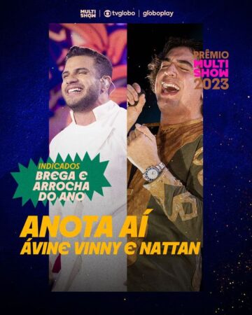 O cantor sobralense Avine Vinny foi indicado ao Prêmio Multishow 2023, na categoria “Brega e Arrocha”, com a música Anota Aí, gravada com seu amigo Nattan. “ QUE ALEGRIA IMENSA! Muito obrigado pela oportunidade @multishow! Tô muito feliz!❤️” comemorou Avine através de suas redes sociais.