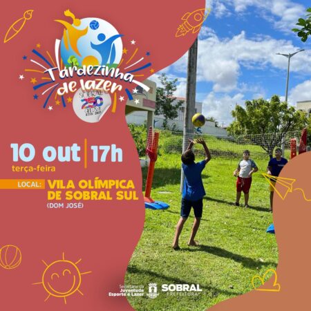 O projeto Tardezinha de Lazer estará na Vila Olímpica de Sobral Sul, localizada no bairro Dom José, nesta terça-feira (10/10). A partir das 17h, a Secretaria da Juventude, Esporte e Lazer (Secjel) promoverá diversas atividades lúdicas, práticas esportivas e momentos de diversão para a criançada.