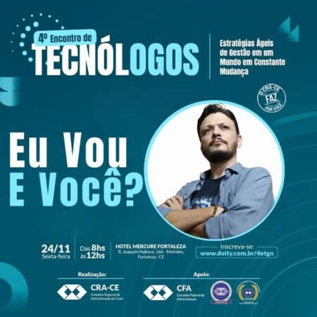 O Conselho Regional de Administração do Ceará tem a honra de convida-lo para o Evento 4º Encontro de Tecnólogos, a ser realizado no dia 24 de novembro, a partir das 08h, no Hotel Mercure Fortaleza. É a sua oportunidade de explorar as mais recentes tendências em gestão ágil e inovação. Participe!