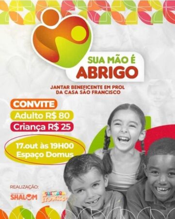 A Comunidade Shalom de Sobral realiza nesta terça-feira, 17 de outubro, no Buffet Domus, no bairro Belchior, um Jantar Beneficente em prol da Casa São Francisco, que abriga crianças em situação de risco e abandono em Sobral e da região norte. A ideia é angariar fundos que possam contribuir para a manutenção dos custos da Casa. O convite custa R$ 80 (adultos) e R$ 25 (crianças), e podem ser adquiridos com membros da Comunidade Shalom. Para maiores informações, chame no whatsapp (88) 98827-0443