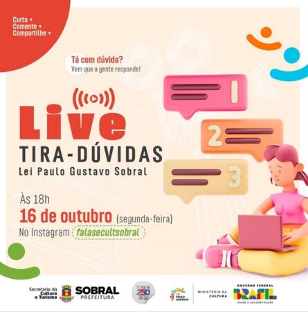 Tá com duvidas para se inscrever nos editais da Lei Paulo Gustavo? Vem que a gente te ajuda!! Nesta segunda-feira (16/10), às 18h, iremos realizar uma live no Instagram da Secretaria da Cultura de Sobral (@‌falasecultsobral)! Esse momento é ideal para tirar suas duvidas. Não perca!