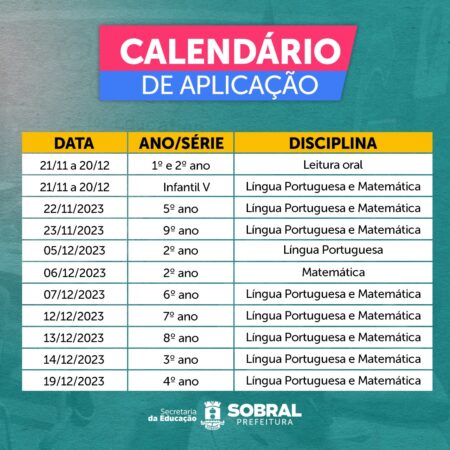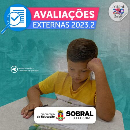 A Secretaria da Educação de Sobral divulgou, nesta terça-feira (14/11), o calendário das Avaliações Externas de 2023.2, que acontecerão entre os dias 21 de novembro e 20 de dezembro, em todas as 85 escolas de Ensino Fundamental I e II e nos Centros de Educação Infantil.