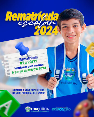 A Secretaria da Educação de Forquilha comunica aos pais ou responsáveis dos alunos da rede pública de ensino que as REMATRÍCULAS DOS VETERANOS ocorrerão até 22 de Dezembro de 2023, na própria escola. Já as Matrículas para ALUNOS NOVATOS serão feitas a partir de 02 de Janeiro de 2024.