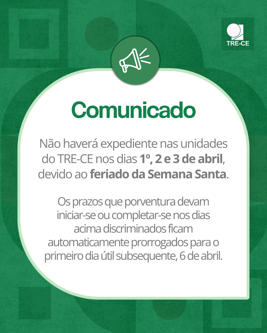 TRE-CE comunica que não haverá expediente no período de 1º a 3 de abril,