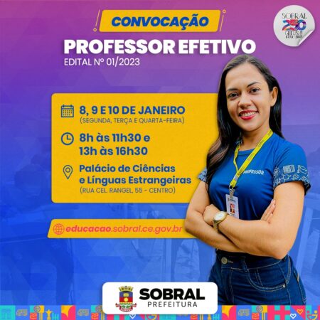 A Prefeitura de Sobral, por meio da Secretaria da Educação (SME) e do Planejamento e Gestão (Seplag), está convocando candidatos aprovados no concurso público de professores da educação básica (edital nº 01/2023). A entrega dos documentos será realizada nos dias 8, 9 e 10 de janeiro de 2024 (segunda, terça e quarta-feira), das 8h às 11h30 e das 13h às 16h30, no Palácio de Ciências e Línguas Estrangeiras, localizado na Rua Cel. Rangel, 55 – Centro.