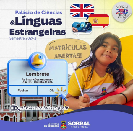 As inscrições seguem até 11 de janeiro de 2024, exclusivamente pela internet. Não deixe para a última hora! Esta é sua chance de aprender um novo idioma.
