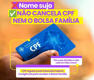 Não é verdade que ter o nome “sujo” na praça, por conta de pendências financeiras, vai cancelar ou deixar irregular o CPF de quem recebe o Bolsa Família. É falsa a notícia de que a existência de dívidas financeiras afeta o cadastro dos beneficiários dos programas sociais do governo federal.