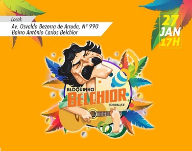 Em Sobral, o Bloquinho Belchior, organizado pelo promoter César Macedo e pelas empresárias Mônica Duarte e Lisandra Couras, movimentará o bairro Belchior, na praça do Loteamento Boa Vizinhança 2, no sábado (27/1), a partir das 17h, ao som da banda Frevilhando. As camisas estão a venda por apenas R$ 50,00 na loja Unni Shop, do Sobral Shopping, e no restaurante Stroggoo, no bairro Belchior. Maiores informações através do telefone (88) 99946.6170