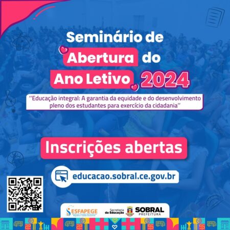 A Secretaria da Educação de Sobral promoverá, entre os dias 23 e 25 de janeiro, o “Seminário de Abertura do Ano Letivo de 2024”, que este ano tem como tema “Educação integral: A garantia da equidade e do desenvolvimento pleno dos estudantes para exercício da cidadania”. As inscrições são gratuitas e seguem abertas até o dia do evento.