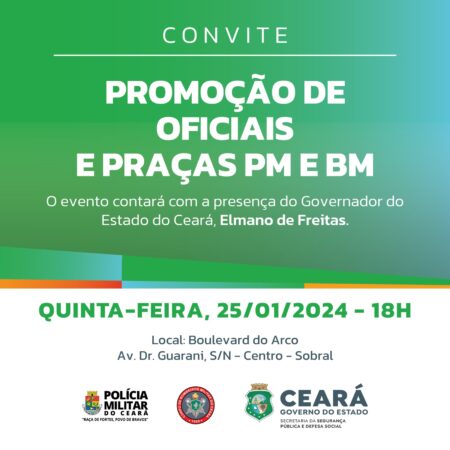 Nesta quinta-feira (25/1), às 18h, no Boulevard do Arco, em Sobral, o Governo do Ceará realizará a promoção de praças e oficiais do Corpo de Bombeiros Militar do Ceará e da Polícia Militar do Ceará. A cerimônia contará com a presença do governador Elmano de Freitas e do secretário da Segurança Pública e Defesa Social, Samuel Elânio. Desde 2015, o Governo do Ceará realizou mais de 30 mil promoções.
