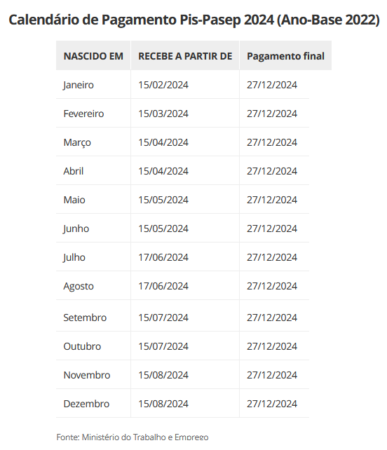 Neste ano, os pagamentos começam a partir de 15 de fevereiro, mas a disponibilização do benefício varia conforme o mês de nascimento do trabalhador (veja o calendário abaixo). Todos os beneficiários poderão sacar o dinheiro até o dia 27 de dezembro. Recebem o PIS (Programa de Integração Social) trabalhadores da iniciativa privada. O pagamento é administrado pela Caixa Econômica Federal.