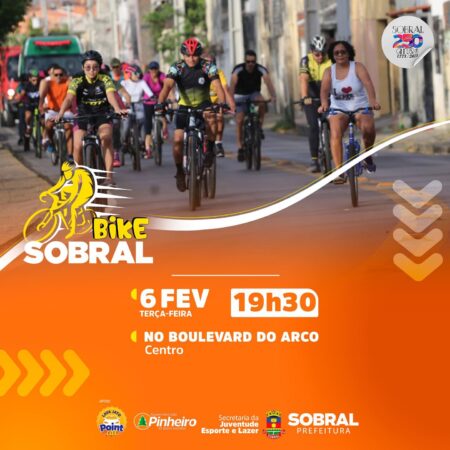 Terça-feira é dia de pedalar pelas belas ruas de Sobral com o turma da Secretaria de Esporte, Lazer e Juventude. O ponto de encontro será no Boulevard do Arco, nesta terça-feira (6/2), a partir das 19h30.