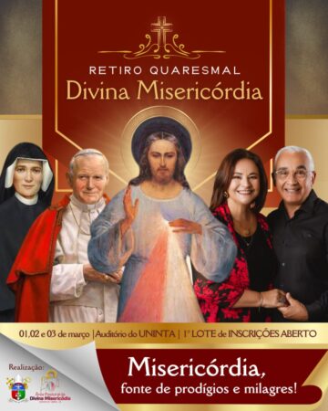 Devotos da Divina Misericórdia, a partir de agora está aberto o primeiro lote de inscrições para o Retiro Quaresmal da Divina Misericórdia, que acontecerá nos dias 01, 02, e 03 de março no auditório do Centro Universitário UNINTA em Sobral-CE, incluindo a presença do casal Ricardo e Eliana Sá, que desempenham um papel pioneiro na divulgação da devoção a Jesus Misericordioso no Brasil.