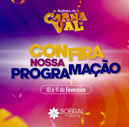 A melhor programação para o seu final de semana de Carnaval você encontra no Sobral Shopping. Serão dois dias de muitas diversão, shows, brincadeiras, oficinas e tudo de melhor para você e toda sua família.