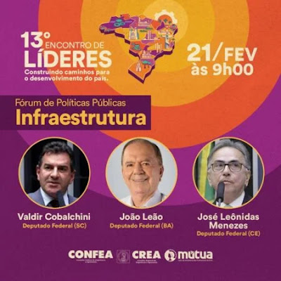 Ex-ministro dos Portos, e uma das maiores autoridades em infra-estutura dentre os 513 deputados federais, o deputado Leônidas Cristino foi convidado pelo Sistema CONFEA para participar, nesta quarta-feira (21/2), as 9h, do 13° Encontro de Líderes do Conselho Federal de Engenharia e Agronomia (Confea). O Fórum conta com a participação de parlamentares de todo o país e debaterá, também, sobre a reforma tributária, saneamento básico, agronomia, habitação e desenvolvimento urbano. Leônidas participará do painel sobre infraestrutura. O evento poderá ser acompanhado, ao vivo, pelas redes sociais do @confea_