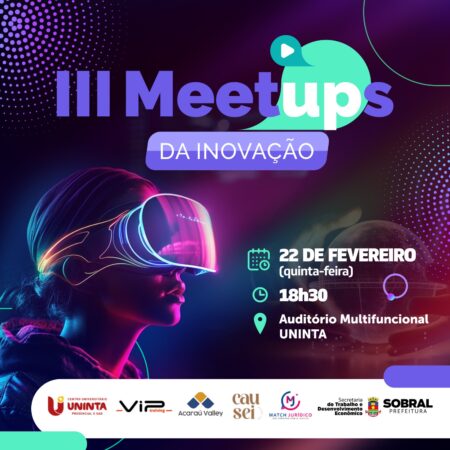 Nesta quinta-feira (22/02), a partir das 18h30, no auditório multifuncional do Centro Universitário Inta (Uninta), a Prefeitura de Sobral, através da Secretaria do Trabalho e Desenvolvimento Econômico (STDE), realizará a terceira edição do Meetups da Inovação, em parceria com o Uninta, Vip Training, Acaraú Valley, Causei e Match Jurídico.