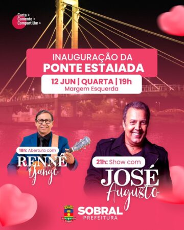 O cenário perfeito para curtir o Dia dos Namorados com o seu amor é na Margem Esquerda do Rio Acaraú, na inauguração da primeira ponte estaiada do Ceará, com a trilha sonora de José Augusto.