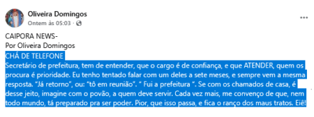 O comunicador relatou que há mais de sete meses tenta contato com um gestor de pasta, mas sempre recebe respostas evasivas como “já retorno” ou “tô em reunião”. Segundo Oliveira, a postura gera sensação de descaso com a população: