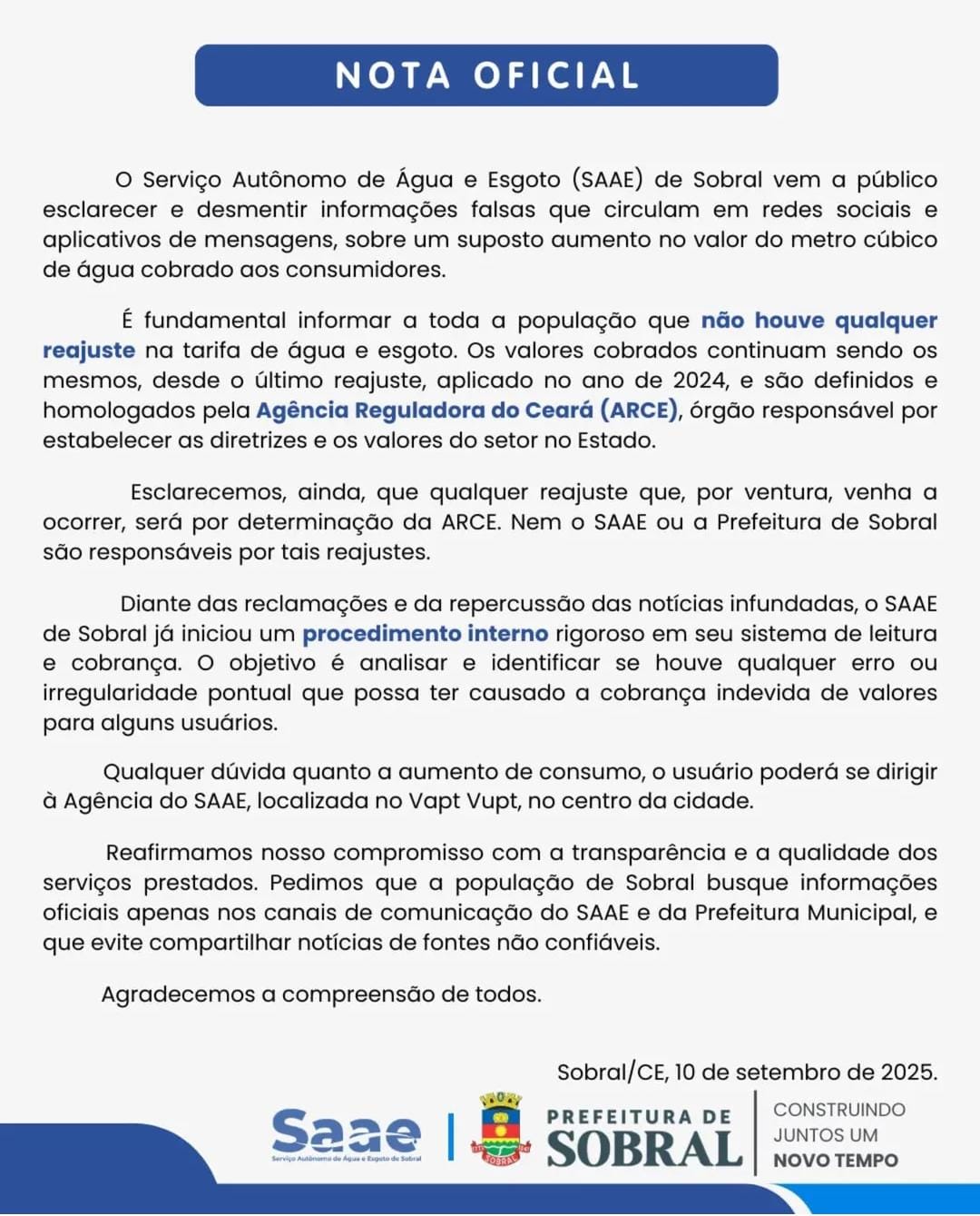 Após a grande repercussão das denúncias divulgadas pela imprensa sobralense sobre os aumentos abusivos nas contas de água do Serviço Autônomo de Água e Esgoto (SAAE) de Sobral, o órgão emitiu uma nota oficial afirmando que não houve reajuste na tarifa desde 2024 e que qualquer mudança só poderia ser determinada pela Agência Reguladora do Ceará (ARCE).