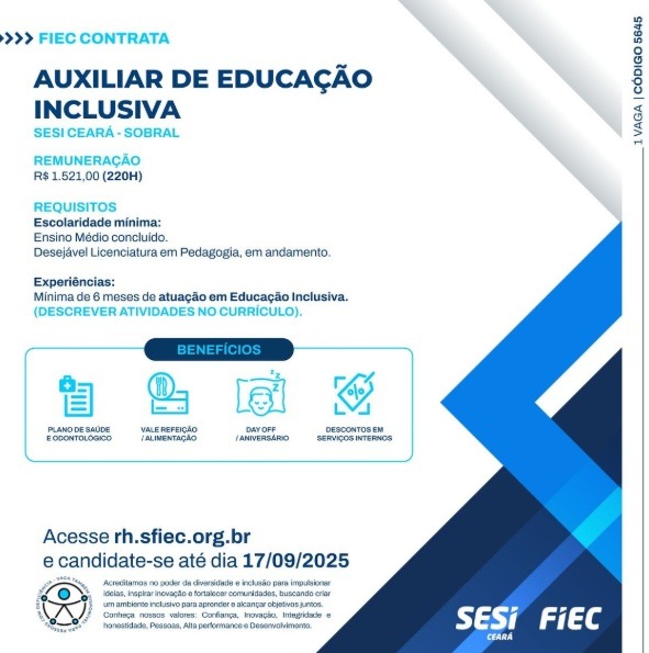 A FIEC está contratando AUXILIAR DE EDUCAÇÃO INCLUSIVA para atuar no SESI Ceará – Sobral.