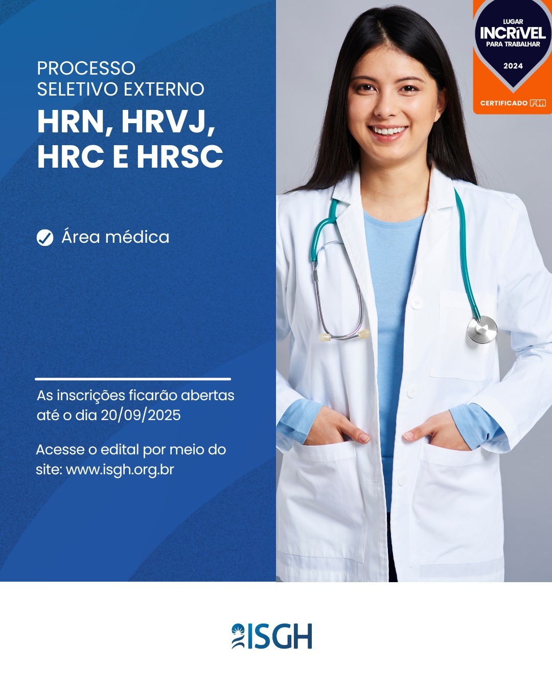 O Instituto de Saúde e Gestão Hospitalar (ISGH) abriu editais para os cargos de: