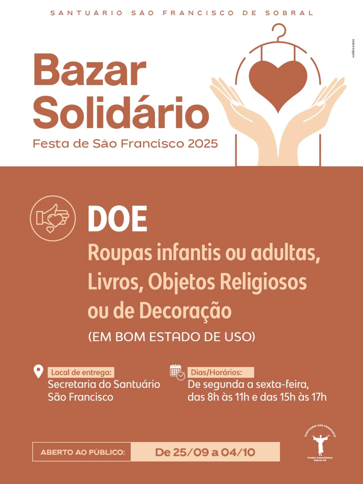 Você pode doar roupas infantis ou adultas, livros, objetos religiosos ou itens de decoração. Cada contribuição será uma forma de levar esperança e alegria a outras pessoas, reforçando o verdadeiro espírito de São Francisco.