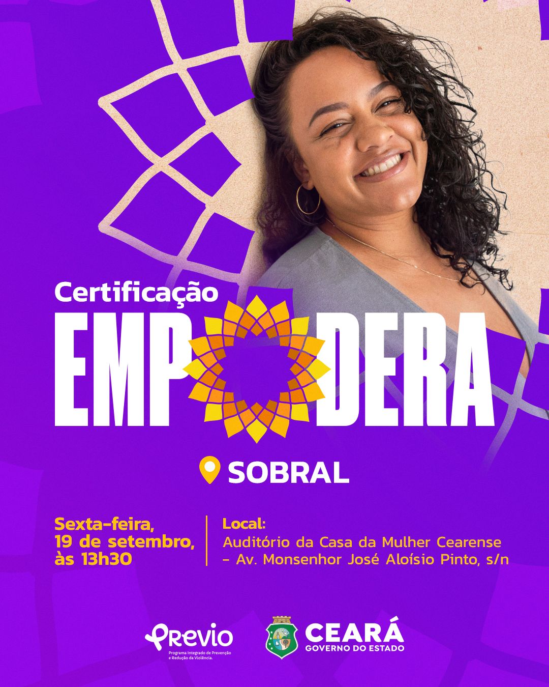 A força das mulheres que transformam realidades será celebrada nesta sexta-feira (19), às 13h30, no Auditório da Casa da Mulher Cearense, em Sobral. O evento marca a certificação das participantes do Projeto Empodera, iniciativa voltada para promover autonomia, aprendizado e superação.