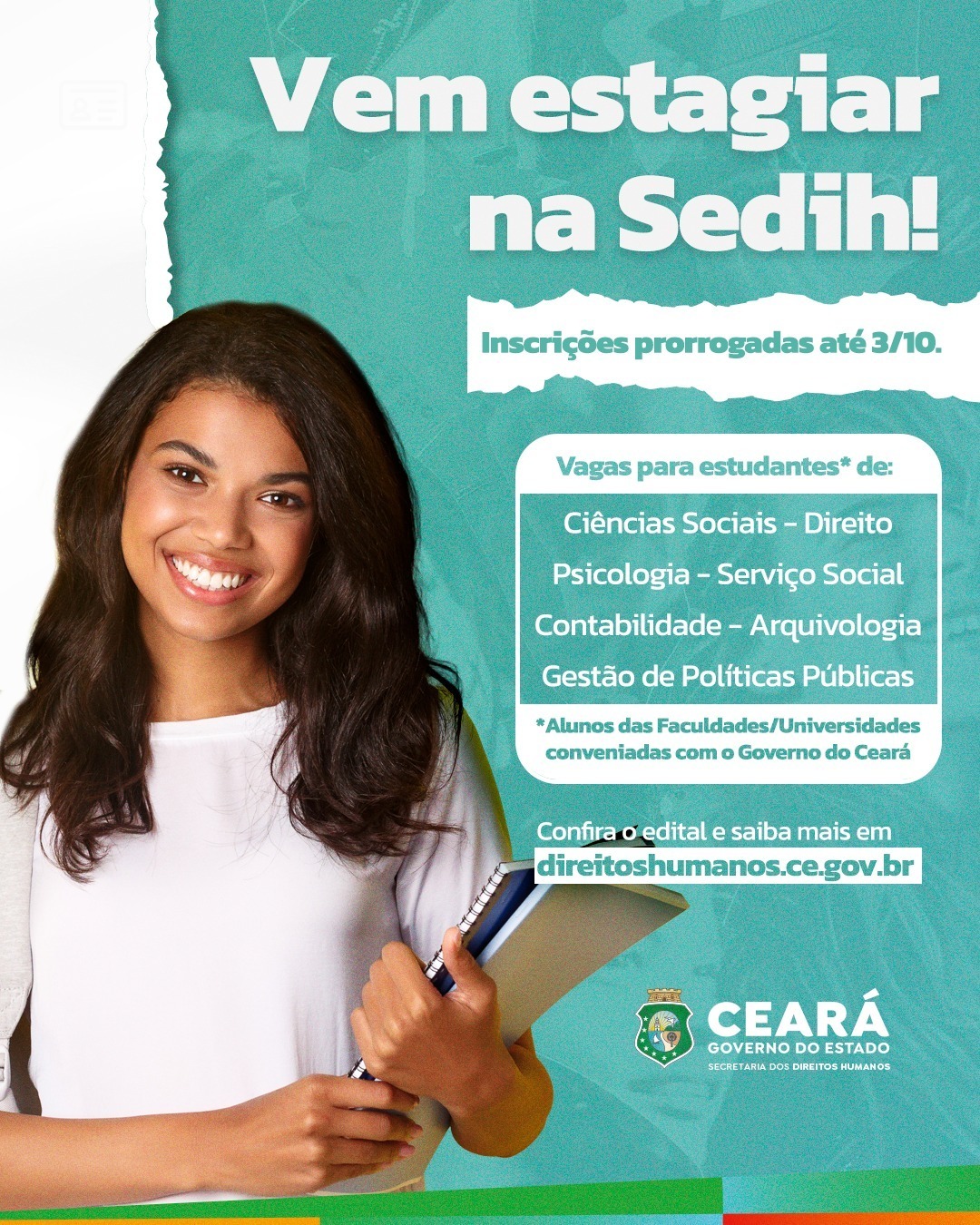 O prazo de inscrição para o processo seletivo destinado ao preenchimento de 15 vagas de estágio de nível superior na Secretaria dos Direitos Humanos do Estado do Ceará (Sedih) foi prorrogado.