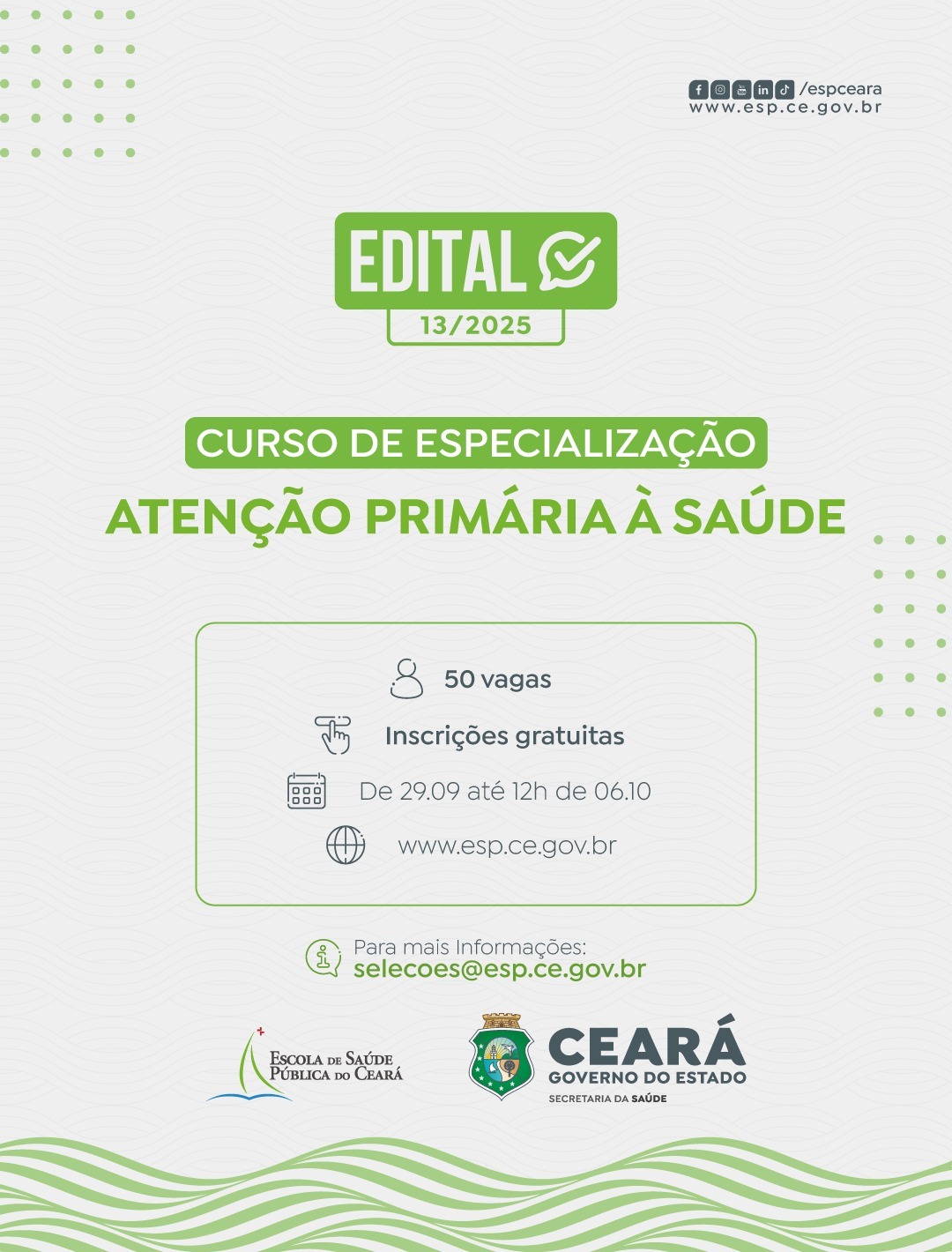 A Escola de Saúde Pública do Ceará (ESP/CE) anunciou a abertura de inscrições para o processo seletivo da nova turma da especialização em Atenção Primária à Saúde (APS). Ao todo, estão sendo ofertadas 50 vagas para profissionais que desejam ampliar seus conhecimentos e contribuir para o fortalecimento do Sistema Único de Saúde (SUS).