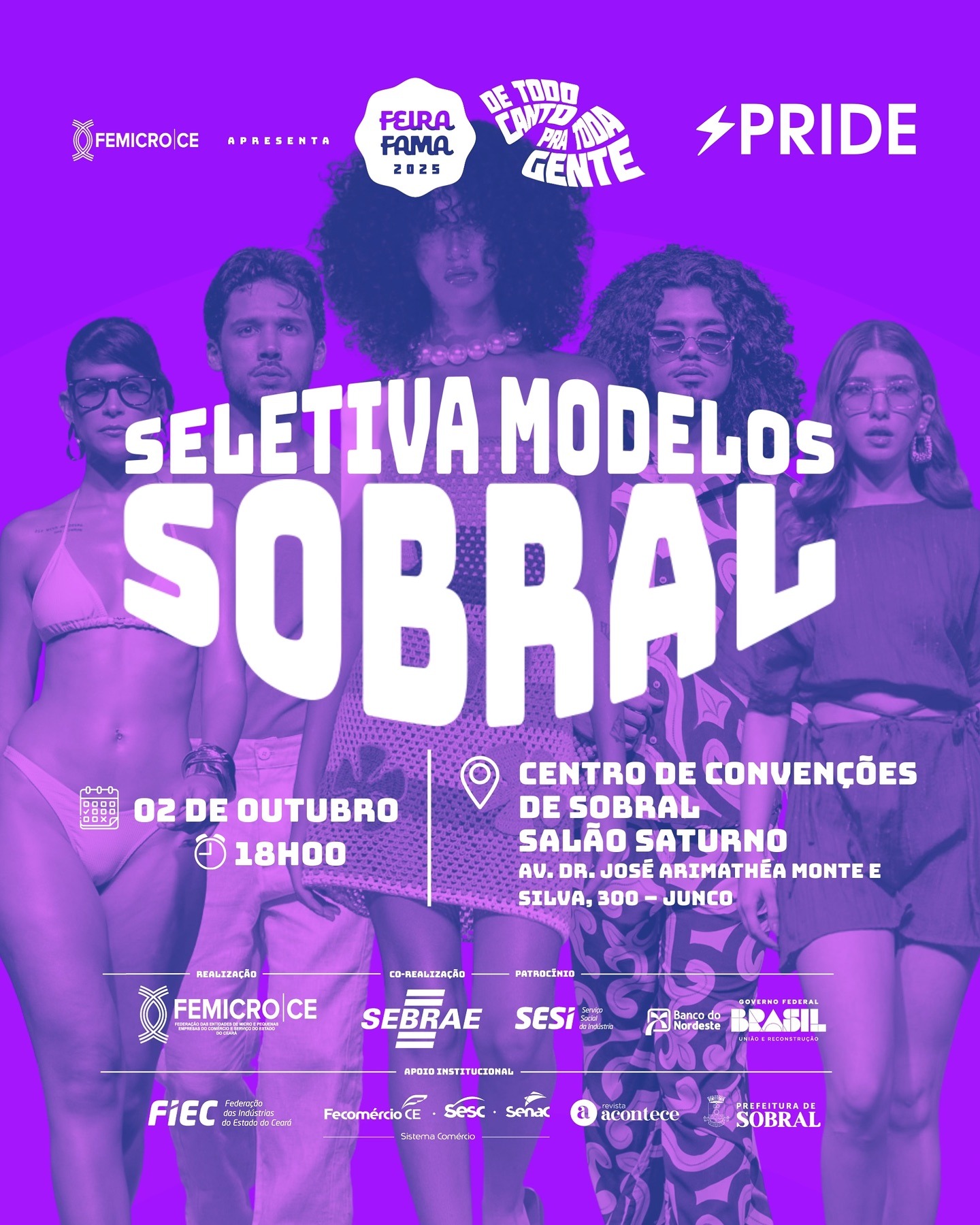 Que tal desfilar na Feira Fama – Sobral, um dos maiores eventos de moda e empreendedorismo da região, que acontecerá de 03 a 05 de outubro, na cidade de Sobral? Pois bem. Na próxima quinta-feira (2/10), as 18h, no Salão Saturno, do Centro de  Convenções de Sobral, acontece a seleção dos modelos, homens e mulheres.