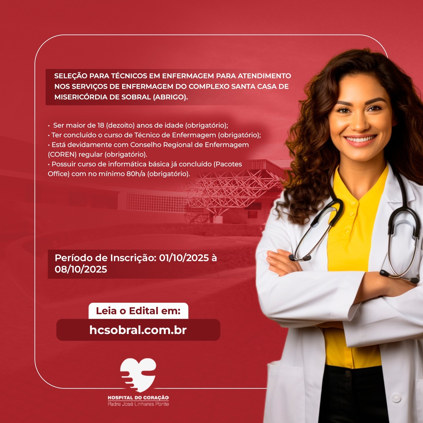 O período de inscrição vai de 1º a 8 de outubro de 2025. O edital completo está disponível no site hcsobral.com.br