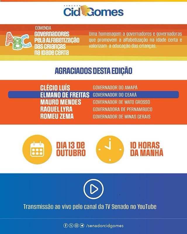 A homenagem, proposta pelo senador Cid Gomes (PSB-CE), reconhece gestores estaduais que se destacaram na implementação de políticas públicas voltadas à alfabetização na idade certa. Serão agraciados os governadores Elmano de Freitas (CE), Clécio Luís (AP), Mauro Mendes (MT), Rachel Lyra (PE) e Romeu Zema (MG).