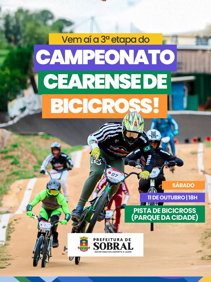 A cidade de Sobral será palco de mais uma grande competição esportiva neste fim de semana. A Prefeitura de Sobral, por meio da Secretaria do Esporte e Lazer (Sesp), realiza neste sábado (11/10), a partir das 16h, a 3ª etapa do Campeonato Cearense de Bicicross 2025, na Pista de Bicicross do Parque da Cidade.