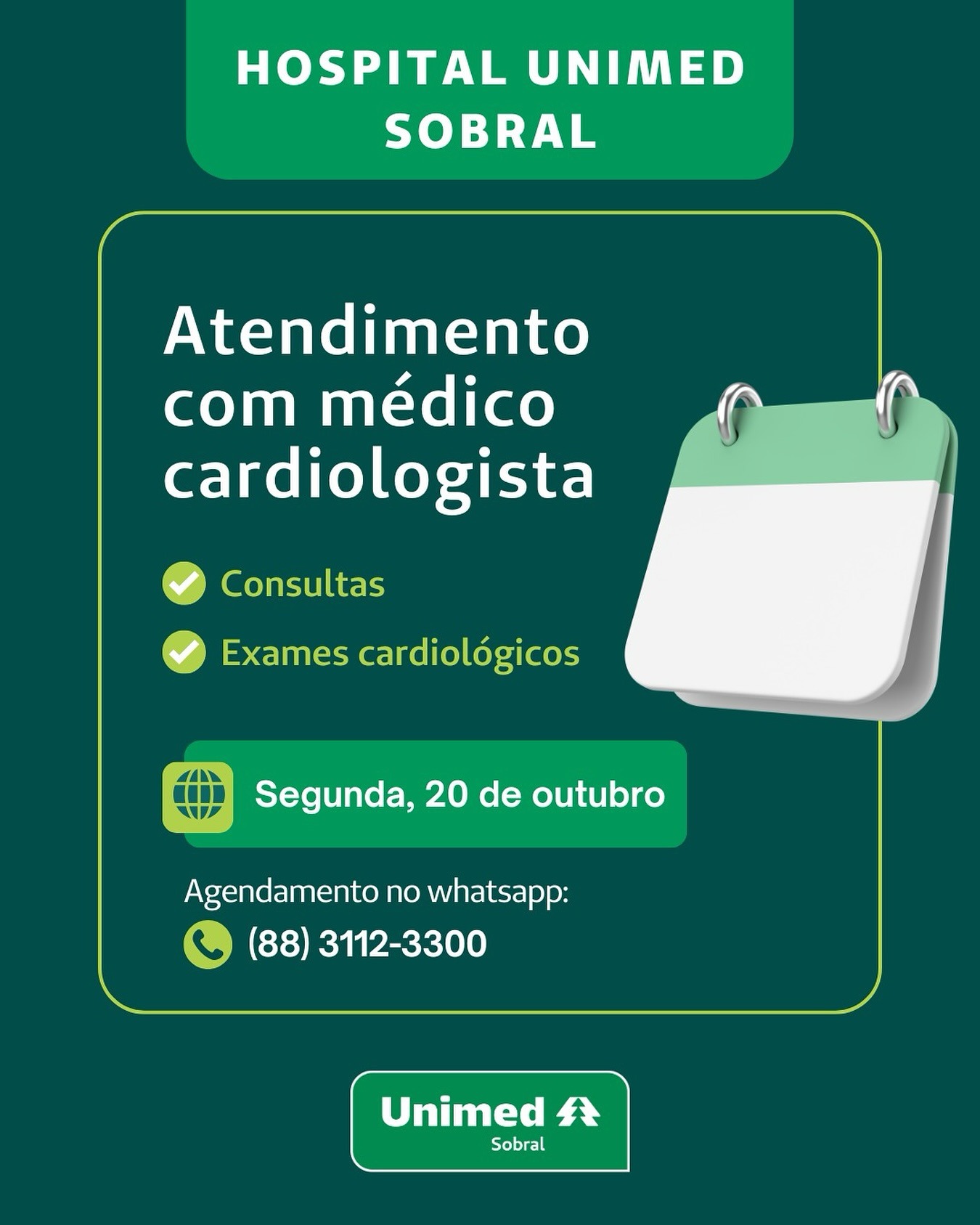O Hospital Unimed Sobral está com agenda aberta para consultas e exames cardiológicos no dia 20 de outubro. É uma excelente oportunidade para cuidar do coração com segurança, atenção e qualidade.