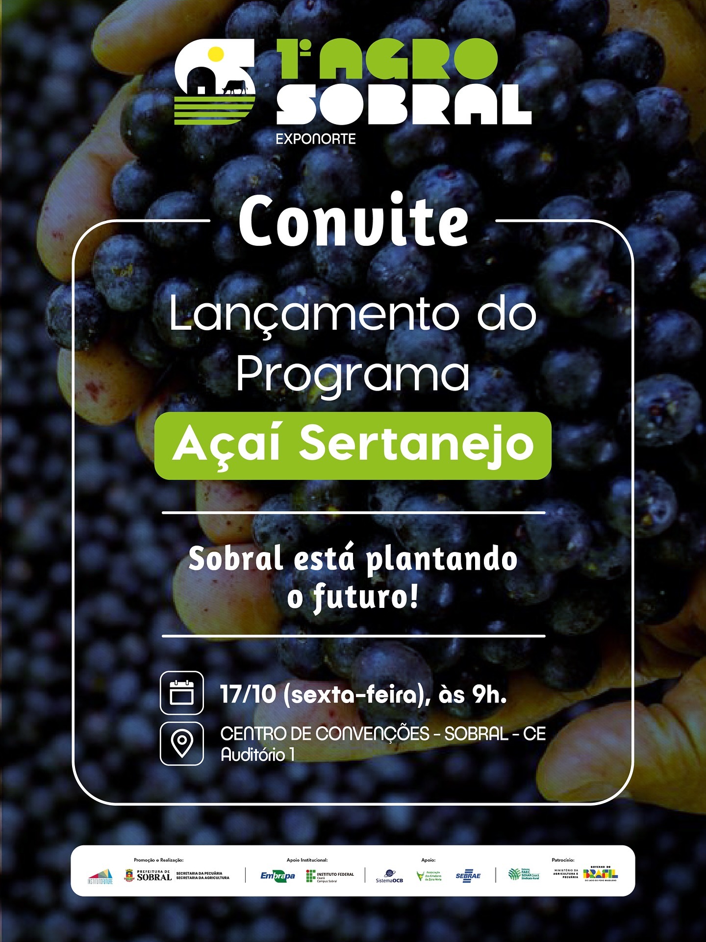 A Secretaria da Agricultura, Pecuária e Abastecimento (Seagri) realiza nesta sexta-feira (17/10), às 9h, no Centro de Convenções de Sobral – Auditório 1, o lançamento do Programa Açaí Sertanejo.