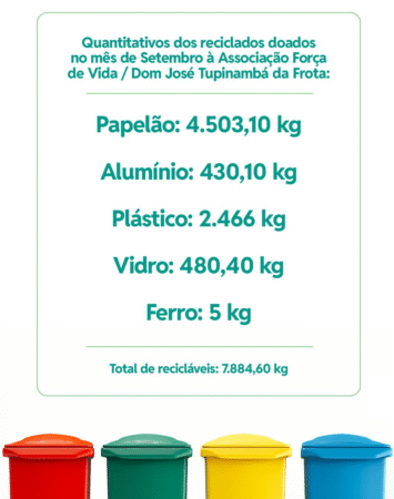 Graças à participação dos lojistas, colaboradores e visitantes, foram 7.884,60 kg de materiais recicláveis destinados à Associação Força de Vida / Dom José Tupinambá da Frota, sendo: