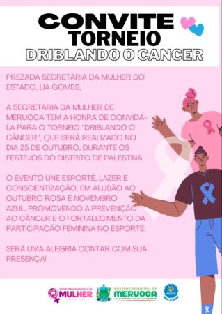 Atendendo convite do prefeito Herton Alves e da secretária municipal das Mulheres, Renata Boto, a secretária estadual das Mulheres e deputada estadual Lia Gomes confirmou presença no torneio “Driblando o Câncer”, promovido pela Secretaria da Mulher de Meruoca. O evento será realizado nesta sexta-feira, 25 de outubro, durante os festejos do distrito de Palestina.